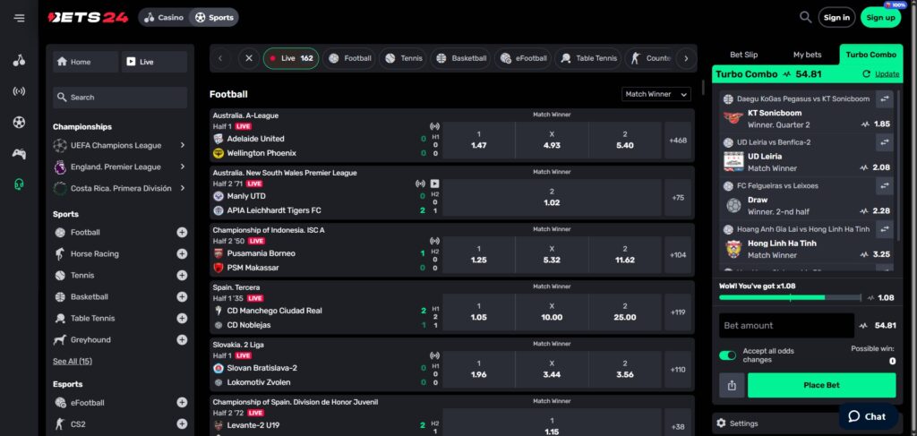 The sportsbook at Bets24 is available to all registered users and doesn’t require switching to a new site or tab. It’s one of the most well-integrated options among non-GamStop sports betting sites. You can bet before the match or during live play, all in the same place.