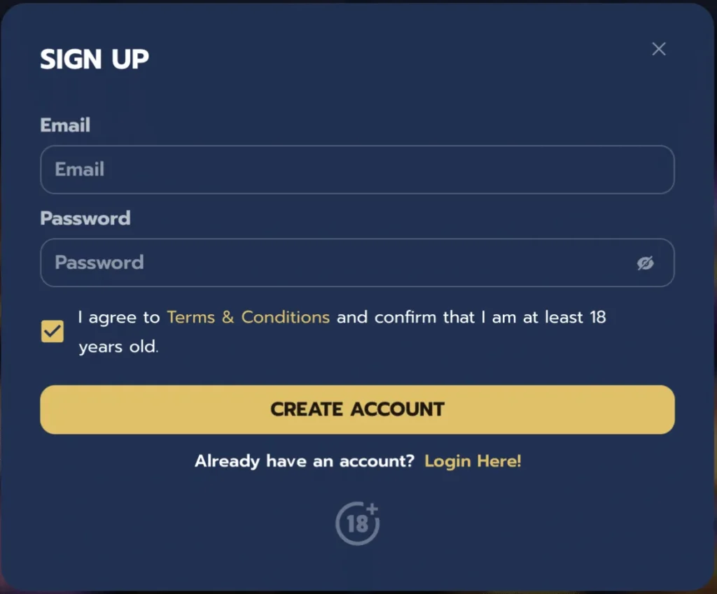 It works even better on your phone. Big Wins put a signup button at the bottom – it’s gold and hard to miss. Clicking it starts a simple sign-up.