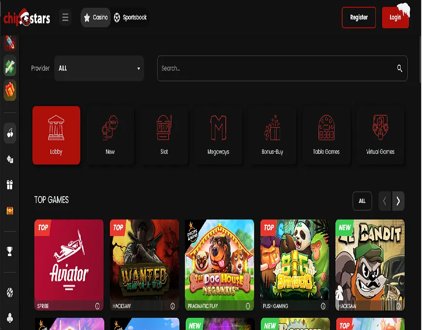 You’ll find that the Casino webpage has no slot types listed. But in their main area, Chipstars puts all their big-prize slots. Just scroll down a bit, and you’ll see groups like Big Prize Games, Top Picks, Hot Games, and Big Wins and Prizes.