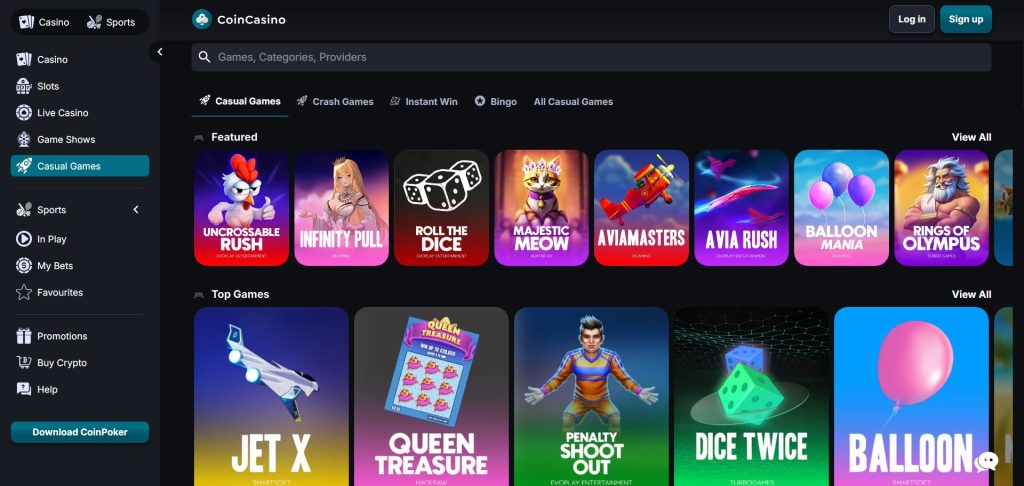 CoinCasino features an extensive library of 4,000+ games, including top-rated slots, new releases, live dealer tables, and casual games.