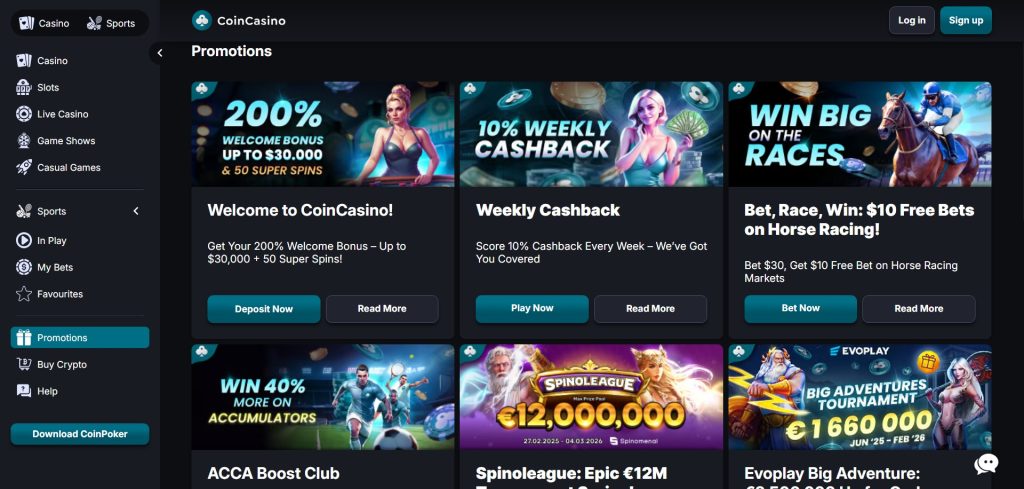 New players can claim a generous 200% Welcome Bonus up to $30,000 plus 50 Super Spins, giving a strong start right after registration. If you want a simple, secure, and rewarding place to play, join CoinCasino today and explore its massive game library.