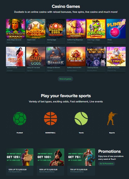 At the shiny new 2022 crypto casino DuoBetz, players can look through a big list of more than 1600 games and bet on sports like tennis, soccer, MMA, esports, and plenty more. Its site has a simple, fun black and green look with a big still sign that shows the top deals below parts for games.