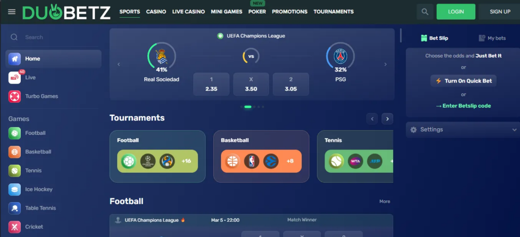 DuoBetz Casino has a lot of ways to bet on sports, with choices for all the big games and leagues. Have fun betting on Soccer, Hoops, Ball games, and more with a wide range of options like Winner, Match Bet, Spread Bet, or Totals. DuoBetz Casino Sportsbook also lets you bet while games are on, which means you can place bets as it all unfolds. With up-to-date odds, deals, and extra perks, you can get the most out of your sports bets at DuoBetz Casino Sportsbook.