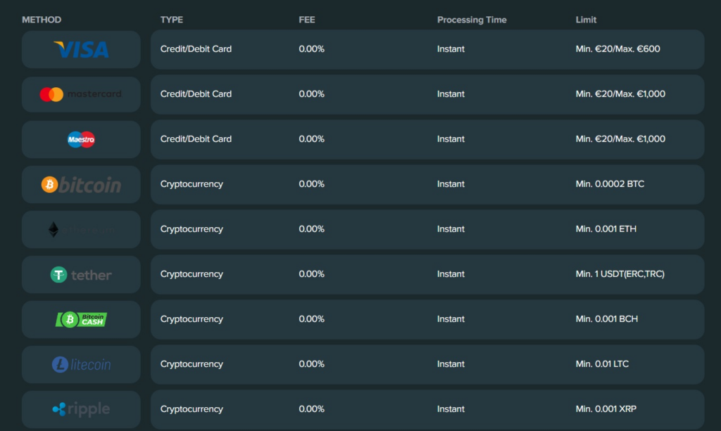 | 💳 Payment Methods | Visa, Mastercard, Maestro, ecoPayz, Bitcoin, and other cryptocurrencies |