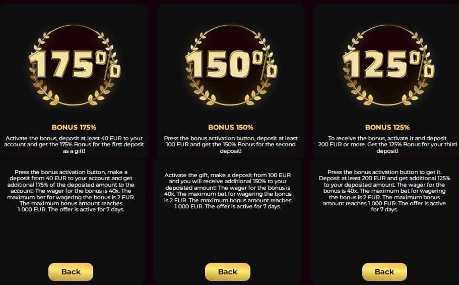 | 🔖 Bonuses and Promotions | 1st deposit: 300% bonus up to €900 2nd deposit: 150% bonus up to €600 3rd deposit: 250% bonus up to €1,500 Monthly bonus: 100% bonus up to €1,000 Weekly cashback: Up to 25% cashback on losses VIP program: Exclusive bonuses and rewards for VIP players |