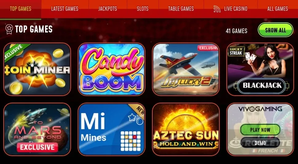 | 🎮 Games | Slot machine, Blackjack, Roulette, live dealer, Crypto Games |