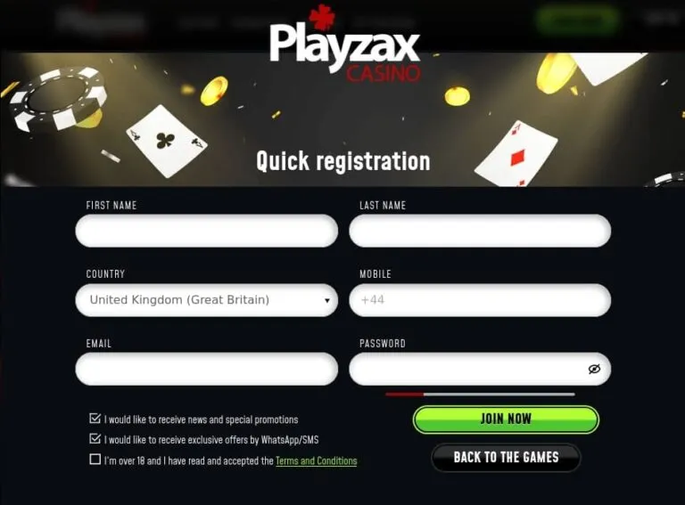 - Head to the site and fill in your own info. Go to PlayZax-global.com and click the “Join Now” button at the top right. It’s green. Put in your first and last name, phone, email, and make sure you are 18 or over.