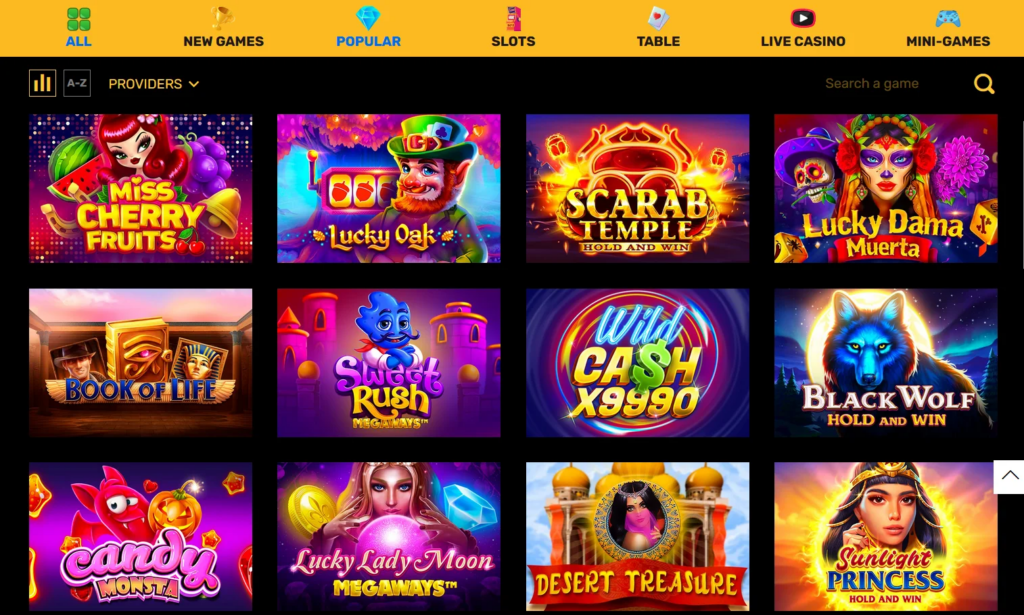 The casino has a neat game area split into groups like New, Popular, Favorites, Slots, Table Games, Live Games, and Mini Games. This makes it easy for players to spot the kind of game they want to play.