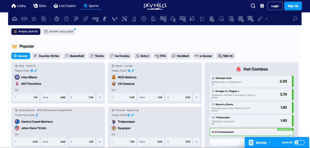 SkyHills Casino offers a comprehensive sportsbook section, catering to a wide range of betting fans.