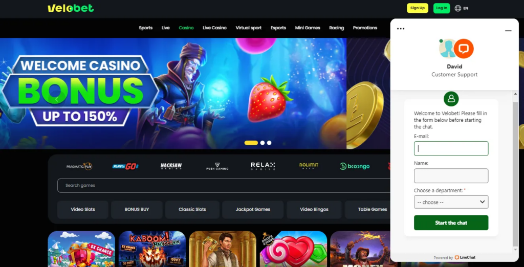 You can talk to them through a chat on the web or send a mail at support@velobet.com. On velobet.com, the chat spot is found under ‘Talk to Us’ at the low right side. Also, just press the blue talk logo that pops up in that spot. The help person will get back to you fast.